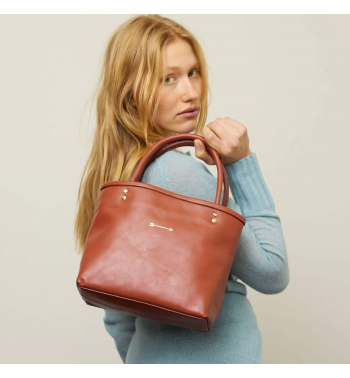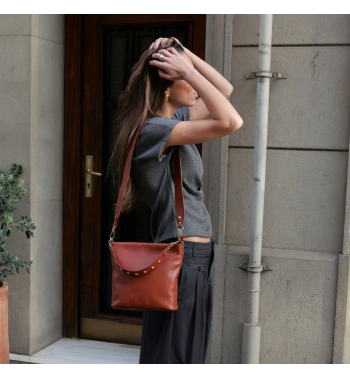 Bolso cubo mediano de piel con dos asas desmontables con remaches. Puedes llevarlo al hombro o cruzado estilo bandolera