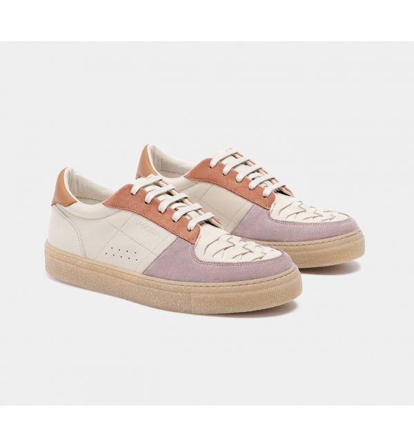 Deportiva de piel vacuna en contraste con piel serraje en malva y teja