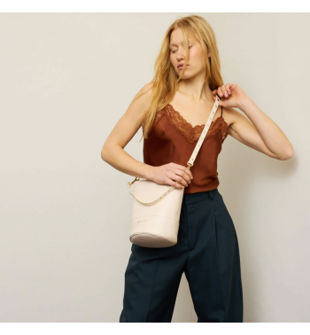 Bolso cubo mediano de piel con dos asas desmontables con remaches. Puedes llevarlo al hombro o cruzado estilo bandolera