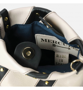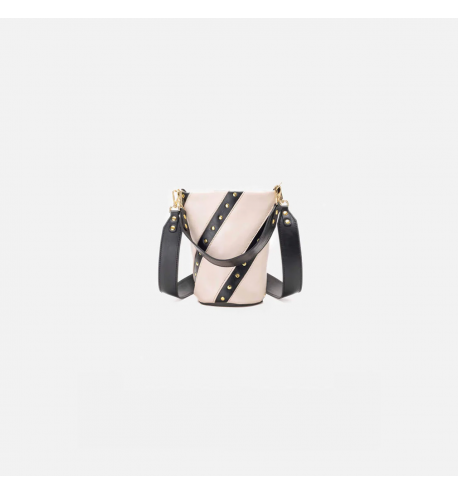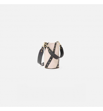 Bolso pequeño de piel con franjas negras con tachuelas doradas. Incluye un asa corta para llevarlo de mano y un asa larga para llevarlo estilo bandolera
