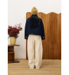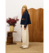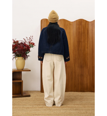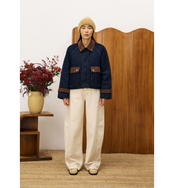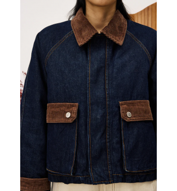 Chaqueta denim corta de corte oversize combinada en tejido denim oscuro con cuello en pana color marrón chocolate, bolsillos y puños