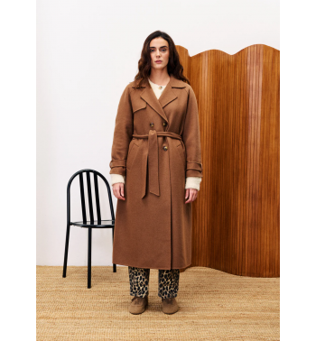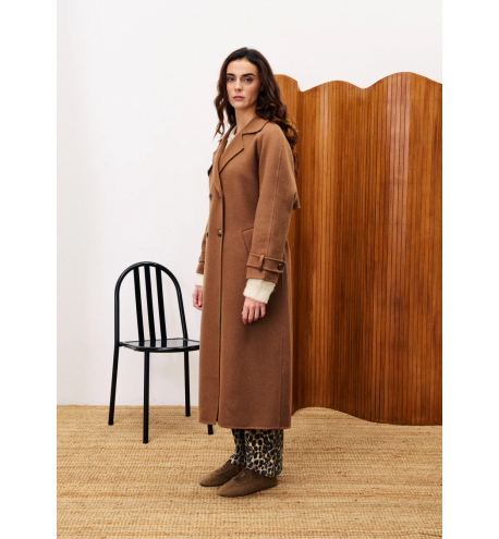 Abrigo largo con solapas y cinturón en color camel con detalle en puños