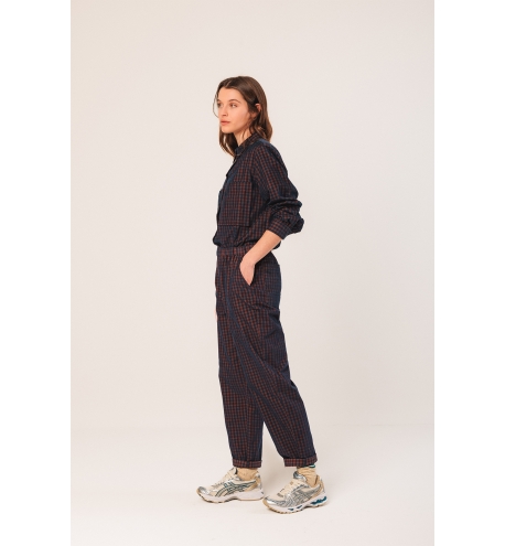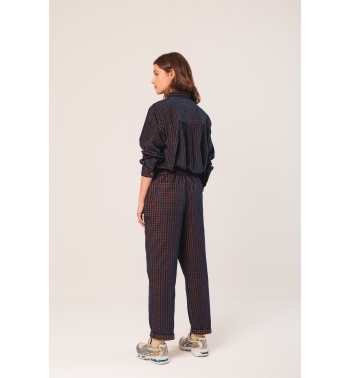Pantalón engomado de micropana con estampado vichy en color navy y marrón con bolsillos laterales