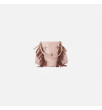 Bolso pequeño de piel con flecos en los laterales combinado en dos colores: bone y teja. Incluye un asa corta para llevarlo de mano y un asa larga para llevarlo estilo bandolera