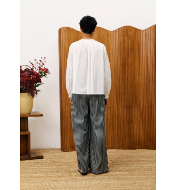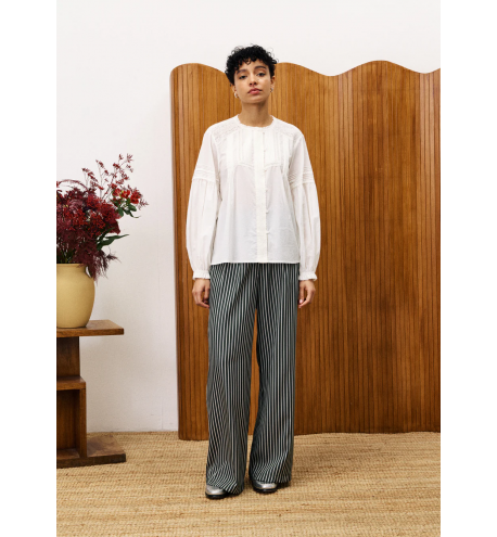 Blusa de manga larga ligeramente abullonada con goma en puños y cuello mao con volante y botones forrados
