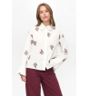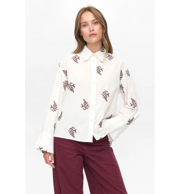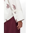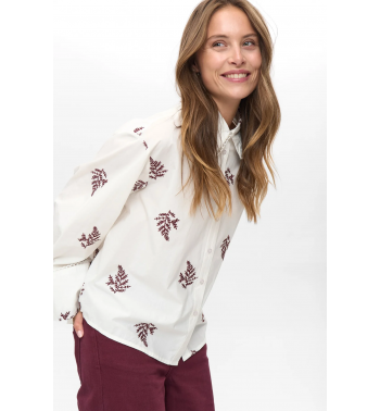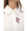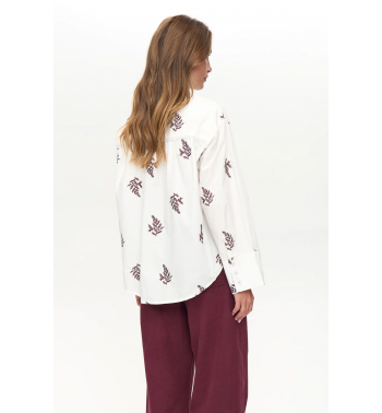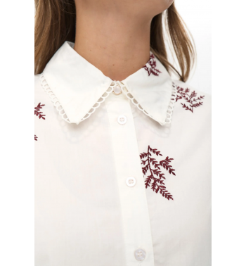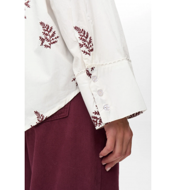 Camisa blanca de corte oversize con motivos bordados en color burdeos y detalles en cuello y puños