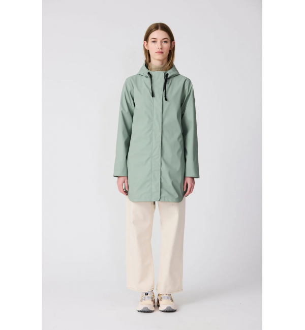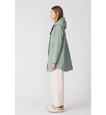 Impermeable de mujer confeccionado en poliuretano que incorpora una capa aislante, ligera y sin plumas