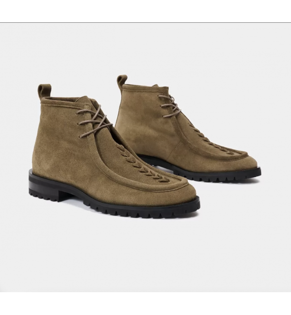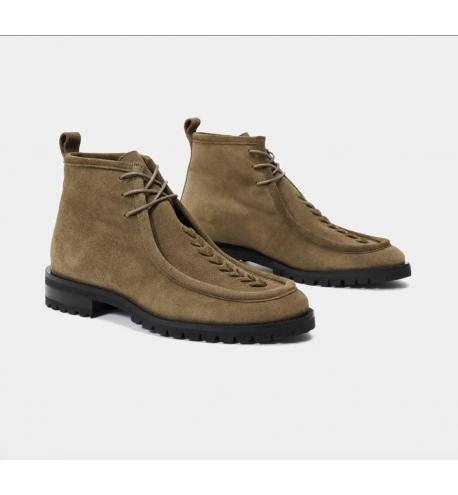 Bota de serraje en color verde con tratamiento hidrofugante y detalle trenzado en el empeine hecho a mano por artesanos