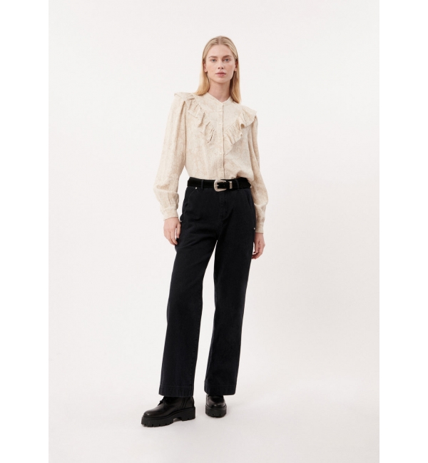 Blusa de manga larga en color beige con detalle volantes en delantero y espalda